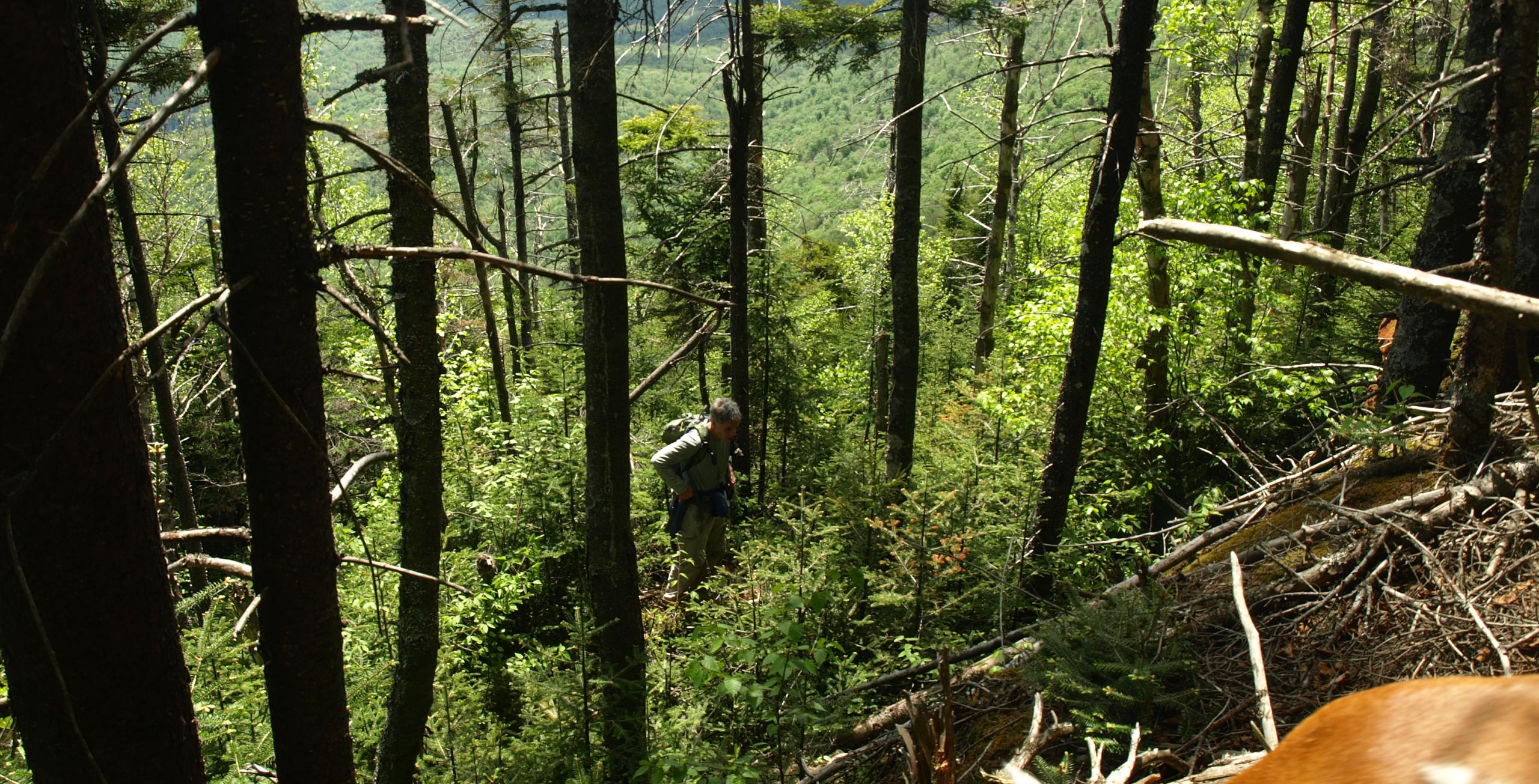 Steeper slopes still awaited, along with several cliffs. Cliffs large enough we had to circumnavigate them to find a resourceful route up and over. They looked to have been good enough to provide nice views, but we came up a bit empty. Beyond the crags was a wall of balsam trees; while much softer than red spruce, they still grew in a thick entangled mess we had to swim through. Atop these thickets was a view, a small one, but a nice one, of Cedar River Flow and Buck Mountain in the distance. At least we got something for all the work accomplished; kind of like waiting for that bi-weekly paycheck, you think it will never come.