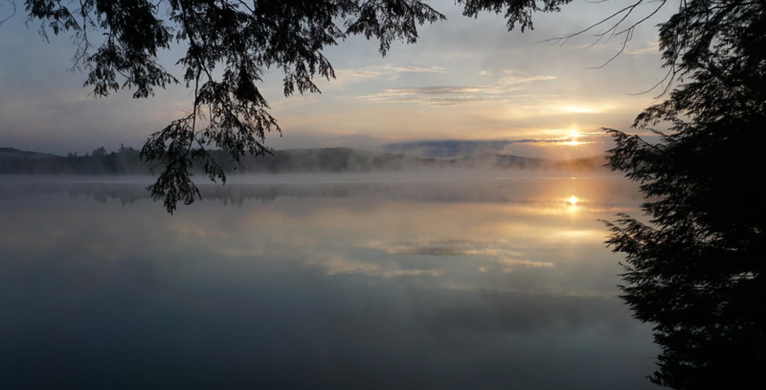 But our progress in camp was slowed by an irresistible sunrise, which cut through the mist hanging over the lake and brought patchy warmth to wherever it landed on the chilly morning. We finished getting ready and headed over to the Horseshoe portion of Hitchins Bog, which is reached along the dirt road heading to Lows Upper Dam.