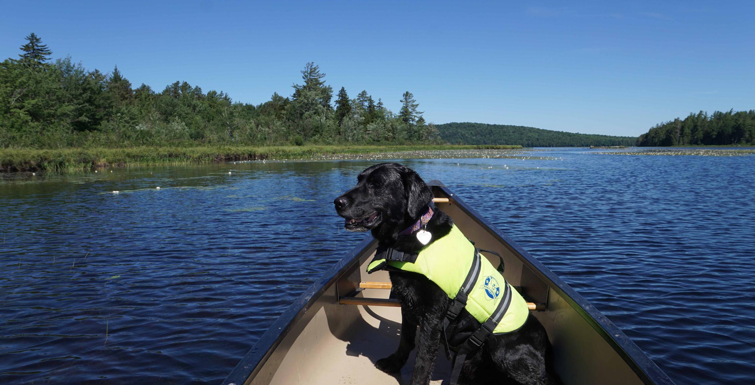 After her disappointment that we didn’t get out of the boat at the take-out, Wren dozed and watched the shoreline like usual, but by the time we began to follow the outline of Round Lake itself, she was becoming a touch antsy – switching her position restlessly with an occasional groan. Our paddling plans had been changed by the beaver dams, after all, and we had been on the water for a while.