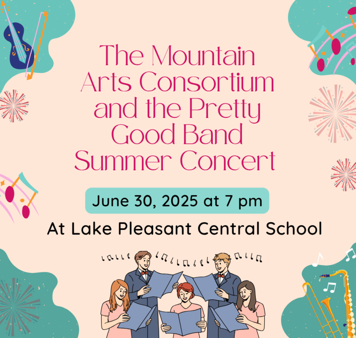 The Mountain Arts Consortium and the Pretty Good Band will perform a concert at 7:00 p.m. on Monday, June 30, at Lake Pleasant Central School.
