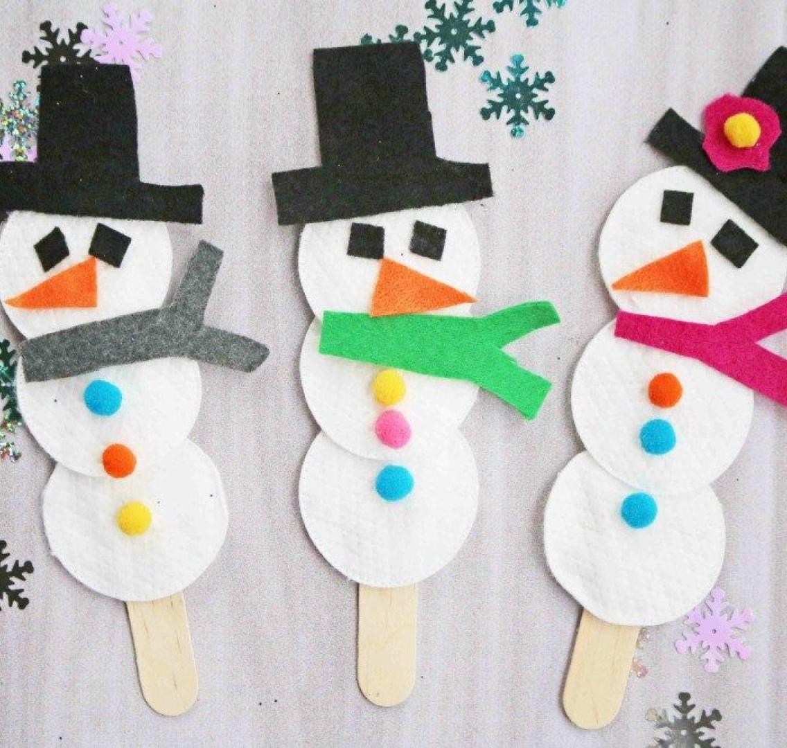 December’s craft lineup features supplies to make a weaving-loom scarf, a yarn hat, a snowman with earmuffs, mitten friends, and a snowman magnet.