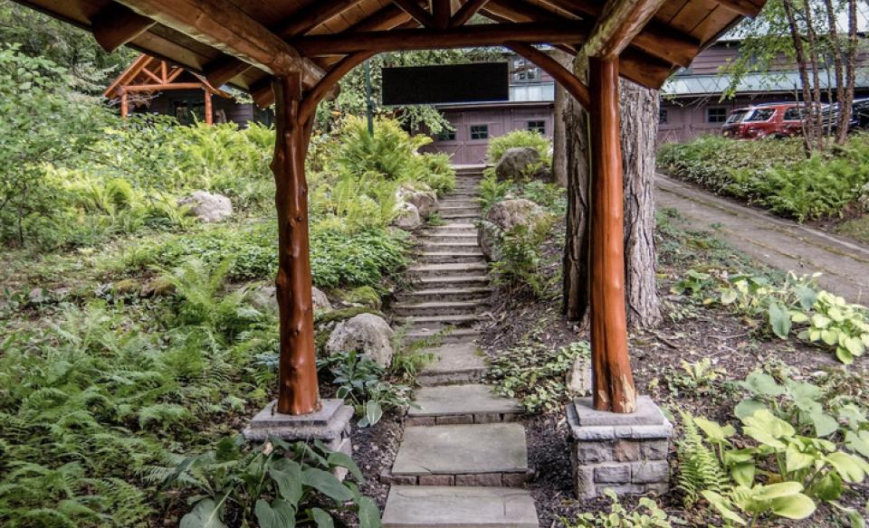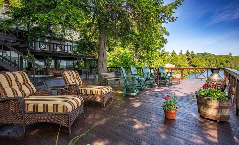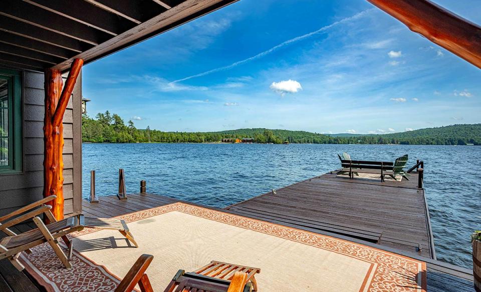 Outside, multiple decks, a private dock, and open natural spaces create plenty of room for swimming, boating, relaxing, and enjoying long days by the lake without ever feeling crowded. The south-facing side of the house has sliding doors that open to a massive main deck. There, one can find an abundance of open seating and lounging areas, a covered BBQ area, as well as ample seating and dining areas suitable for use during inclement weather. Stairs lead down to the boathouse and private docks, providing additional areas available for all types of recreation. The boathouse entertainment area with its bar, refrigerator, and stereo are great for social gatherings and sunbathing. A floating swimming dock awaits offshore. Dock your own boat or water craft at Cliffview after using Inlet’s public boat launch located just minutes from the estate.