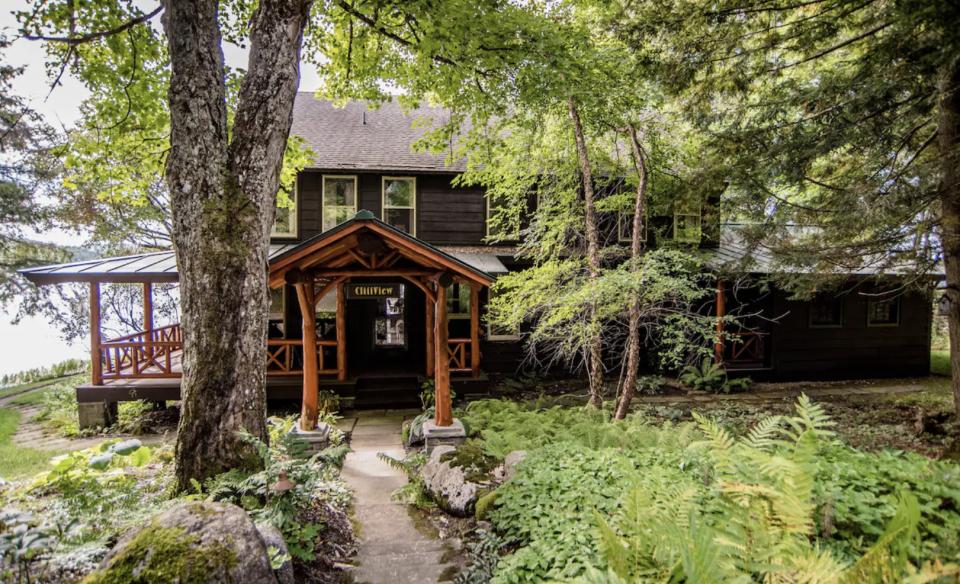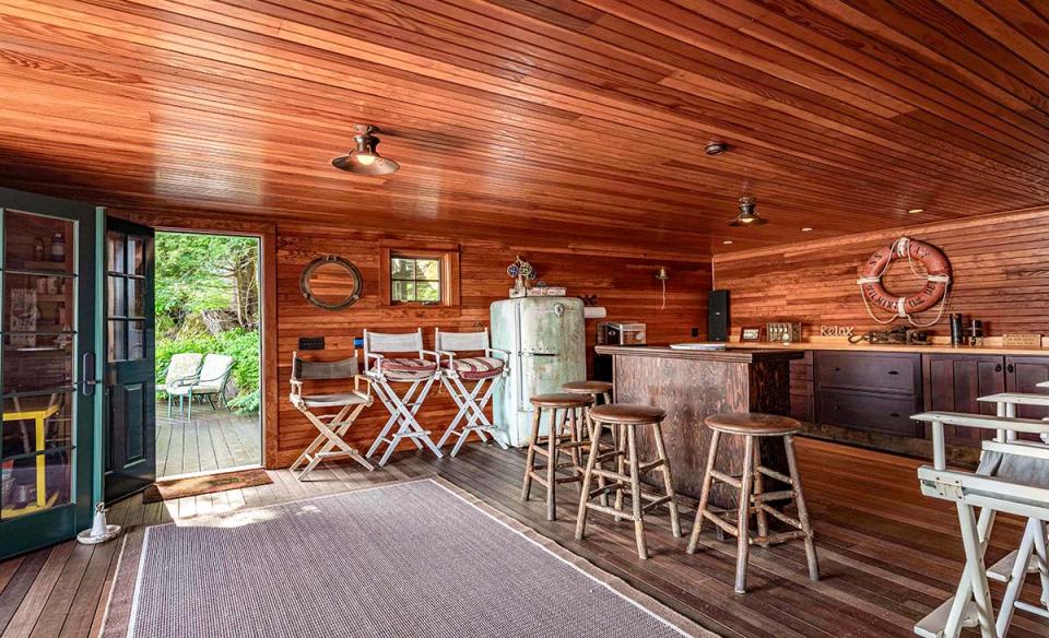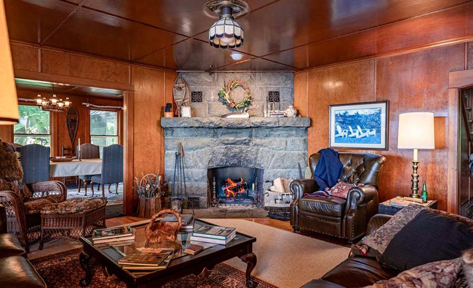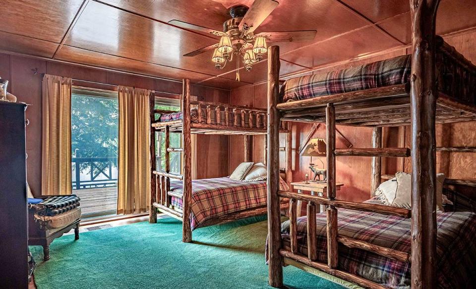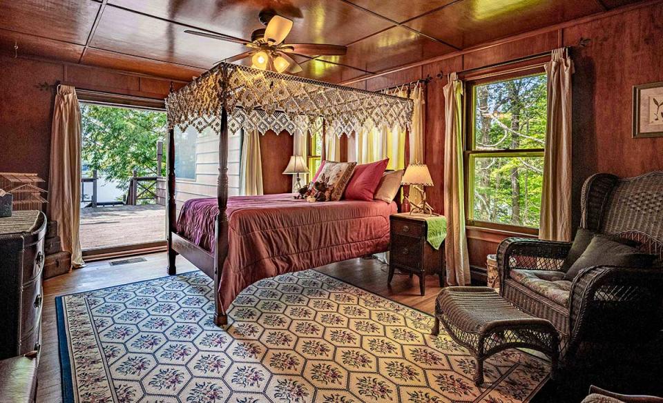 Built in the Adirondack style, the distinctive, spacious main house is designed to comfortably accommodate up to 12 guests, making it ideal for family gatherings or group retreats by the water. Set along a private stretch of shoreline, the home offers expansive living areas where everyone can gather, along with multiple bedrooms that provide privacy and comfort. Large windows fill the house with natural light and showcase beautiful lake views. Ceiling fans hang comfortably throughout wood-paneled rooms, giving the house a natural, grounded vibe. A fully equipped kitchen, generous dining space, and cozy common rooms make it easy to share meals and memories together.