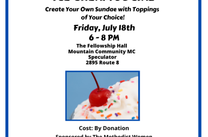 All You Can Eat Ice Cream Sundaes! Join us for Mountain Community Methodist Church’s annual “All You Can Eat” Ice Cream Sundaes event! Location: Mountain Community Methodist Church Date: Friday, July 18th Time: 6:00 PM – 8:00 PM Bring your friends and...