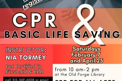 CPR First Aid Class and Certification Certified instructor, Nia Tormey, will instruct a free CPR, First Aid, and Certification Class at the Old Forge Library. Saturday, February 7 from 10 am - 2 pm. The class size is limited to 8 participants, so pre-registration is required. CPR, AED...
