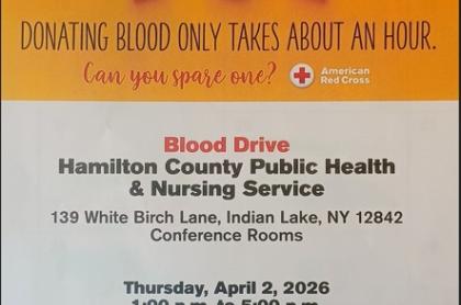 Blood Drive Hamilton County Public Health & Nursing Services is hosting a blood drive! Event Details: Thursday, April 2 1 - 5 pm Hamilton County Public Health & Nursing Services 139 White Birch Lane, Indian Lake, 12842 To Schedule An Appointment: Go to www.redcrossblood.org Enter...