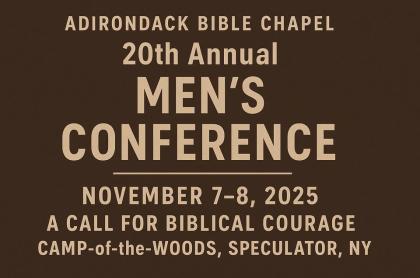 Adirondack Bible Chapel's Men's Conference Join us and be challenged by God’s Word and encouraged by Godly fellowship! This isn’t just a retreat — it’s a rallying cry. In a time when courage is desperately needed, come be equipped, encouraged, and challenged to live...