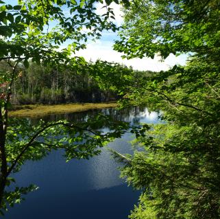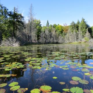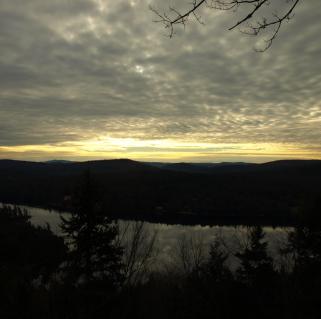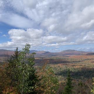 Even before the summit, the trail offers view upon view of the Fulton Chain of Lakes as the trail turns and follows Route 28 for much of the way. I stopped to take in the warm sun and snap some photos while Wren explored with her nose. First through Fourth lakes were below us, and we paused again at the top for more photos and to take a drink while I listened to a flock of pine siskins overhead, going this way and that like a chattering wind.