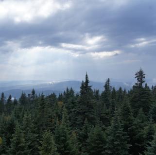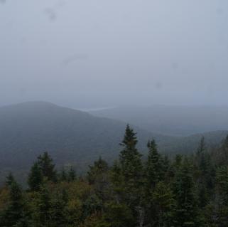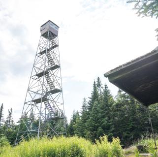The summit is also graced by a well maintained fire tower, which offers great views in all directions of mountains such as Blue Mountain and some of the High Peaks (including Mt. Marcy) visible. When I climbed up the steps for a few photos, Wren insisted on joining me. I don't generally want her on fire tower steps, even if they are well protected, and my trip up them was brief as a result.